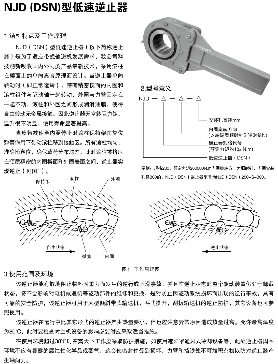 NJD(DSN)型低速逆止器(以下簡稱逆止器)是為了適應帶式輸送機發(fā)展需求,眾誠公司科技創(chuàng)新吸收國內(nèi)外同類產(chǎn)品最新技術,采用滾柱在楔面上的單向離合原理而設計。當逆止器單向轉(zhuǎn)動時(即正常運轉(zhuǎn)),帶有精密楔面的內(nèi)圈和滾柱組件與驅(qū)動軸一起轉(zhuǎn)動,外圈與力臂固定在一起不動,滾柱和外圈之間形成潤滑油膜,使得自由轉(zhuǎn)動無金屬接觸。因此逆止器無空轉(zhuǎn)阻力矩,溫升很不明顯。使用壽命顯著提高。